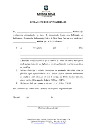 Este documento é uma declaração de responsabilidade assinada por um acadêmico da Faculdade Estácio de Sá de Santa Catarina sobre uma monografia. O acadêmico declara que a monografia é de sua autoria exclusiva e não contém plágio. Ele também assume responsabilidade legal por possíveis violações de direitos autorais.