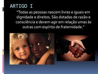 Os primeiros cinco artigos da Declaração Universal dos Direitos Humanos estabelecem que todas as pessoas nascem livres e iguais, proíbem a discriminação, garantindo o direito à vida, liberdade, proibindo a escravidão e tortura.