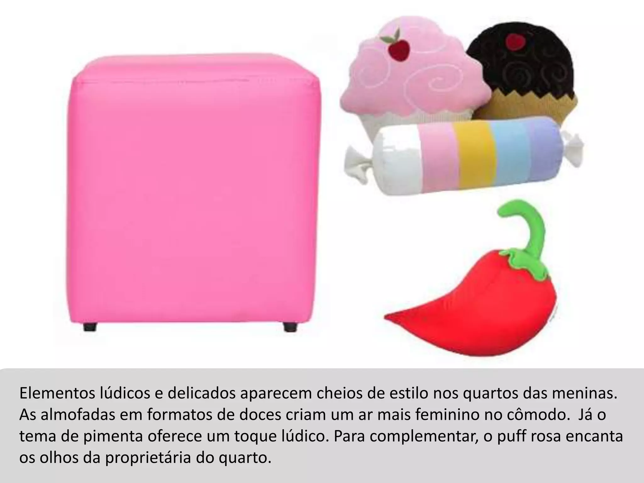 O documento discute opções de decoração para quartos de meninas e meninos, salas e decorações clássicas. Ele sugere usar almofadas e puffs com temas femininos e tecnológicos para quartos, cores fortes e neutras para salas, e tons neutros e suaves para decorações clássicas.