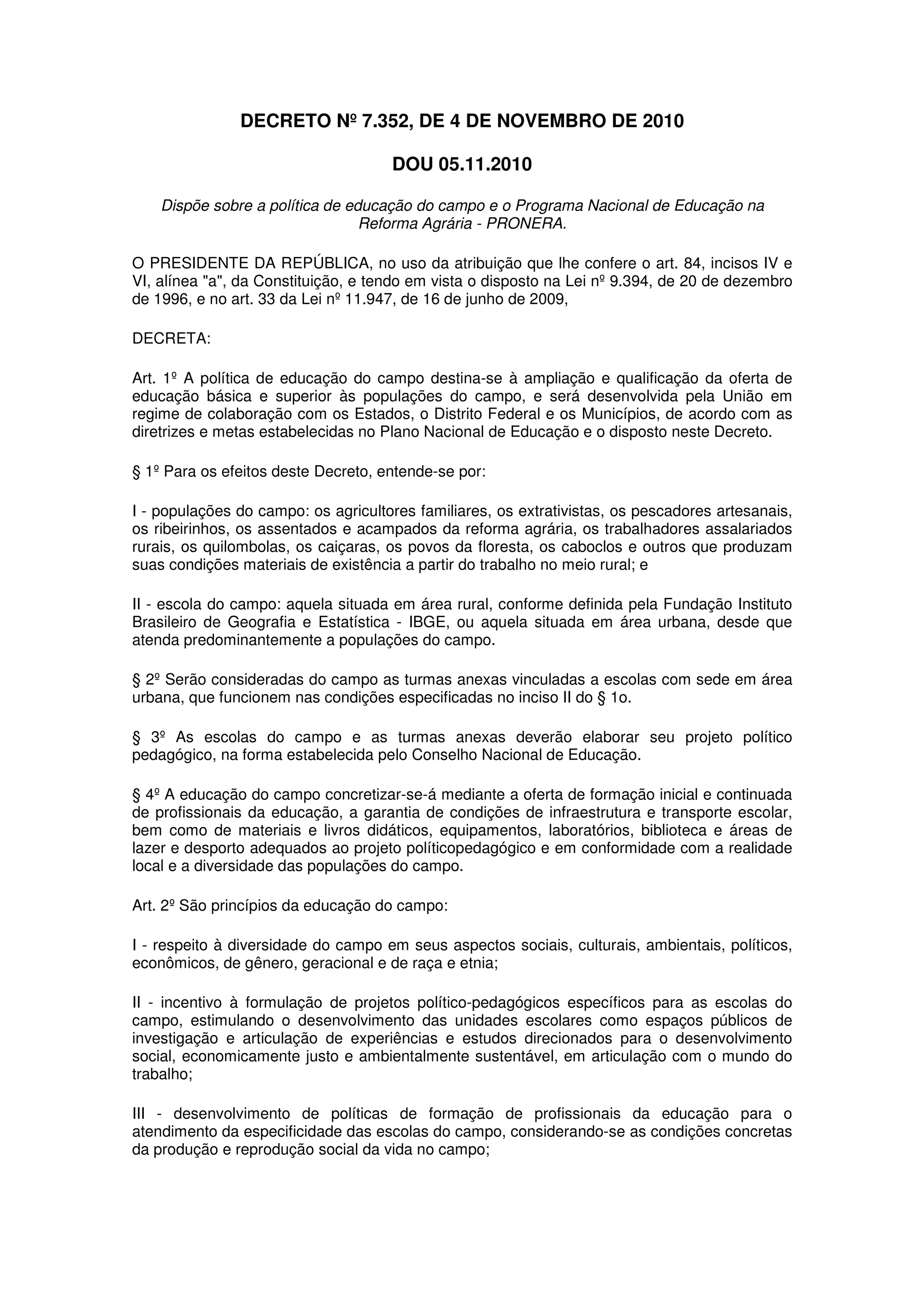 Este decreto estabelece a política de educação do campo no Brasil, definindo suas diretrizes, princípios e ações. Cria o Programa Nacional de Educação na Reforma Agrária (PRONERA) e define seus objetivos de oferecer educação formal aos assentados da reforma agrária.