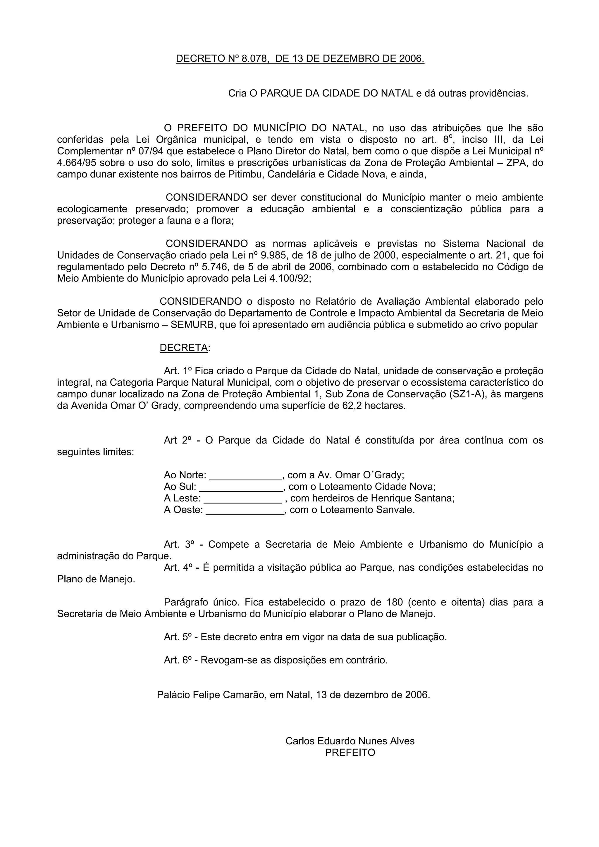 Este decreto cria o Parque da Cidade do Natal, uma unidade de conservação de 62,2 hectares localizada na Zona de Proteção Ambiental 1 em Natal. O parque tem como objetivo preservar o ecossistema de dunas locais. A Secretaria de Meio Ambiente e Urbanismo fica responsável pela administração do parque e terá 180 dias para elaborar o Plano de Manejo.