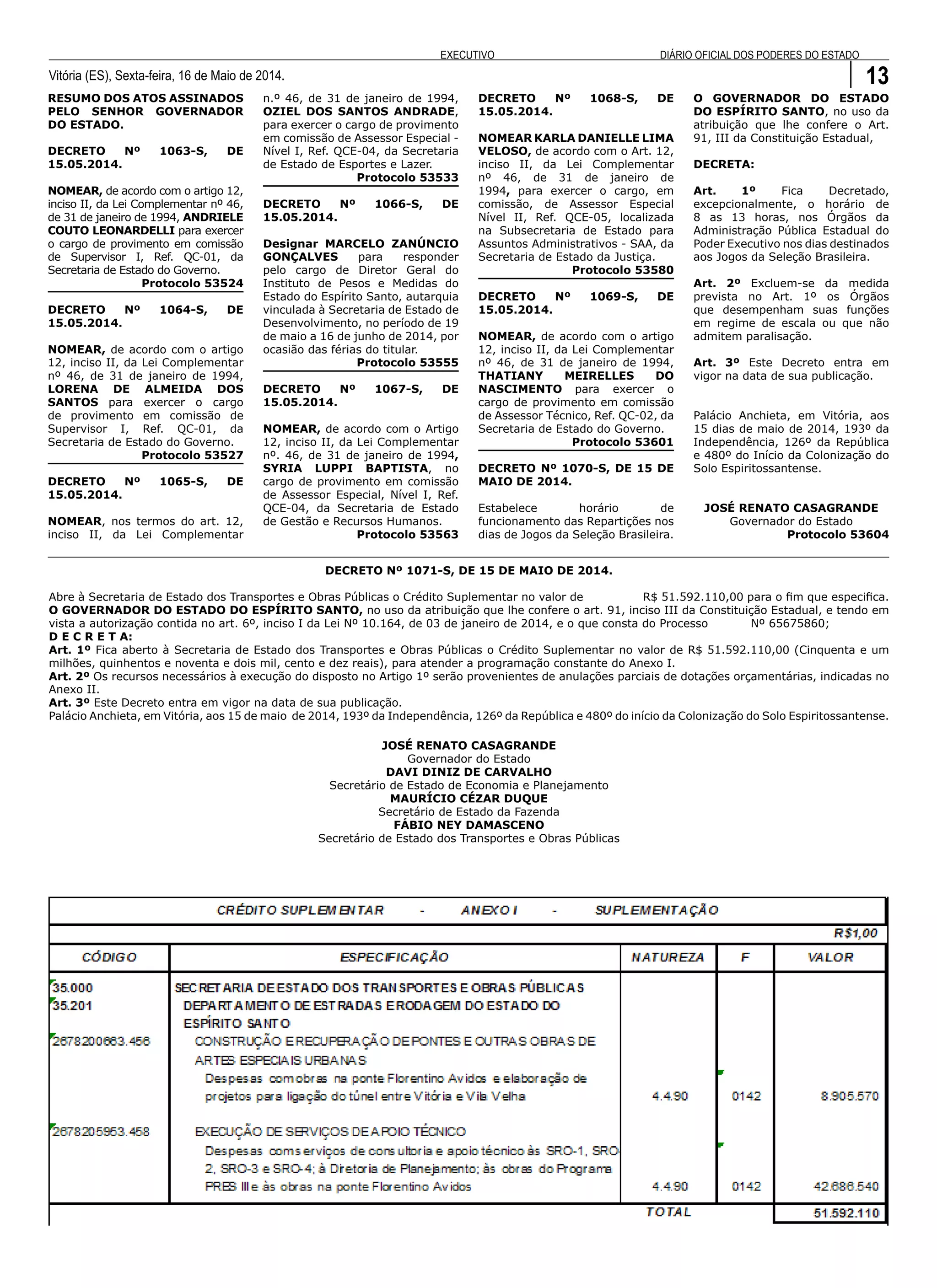 O documento lista decretos assinados pelo governador do Espírito Santo, incluindo nomeações para cargos públicos em diferentes secretarias, designação de responsável interino, e decreto estabelecendo horário especial de funcionamento da administração pública em dias de jogos da seleção brasileira.