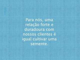 A empresa cultiva relações fortes com clientes com dedicação, cuidando deles como semeaduras para colher bons resultados no futuro. Eles plantam com dedicação e regam com cuidado para obter os melhores resultados dos clientes. Sua dedicação aos clientes é sempre a prioridade.