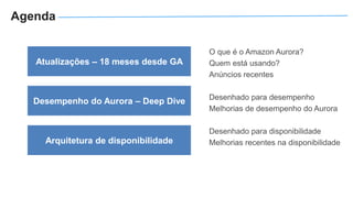 O documento apresenta o Amazon Aurora, um banco de dados relacional gerenciado pela AWS. O Aurora oferece desempenho 5x maior que o MySQL com disponibilidade e segurança equivalentes aos bancos de dados comerciais. O documento discute as melhorias de desempenho e disponibilidade do Aurora, incluindo índices mais rápidos e gerenciamento de bloqueios aprimorado.