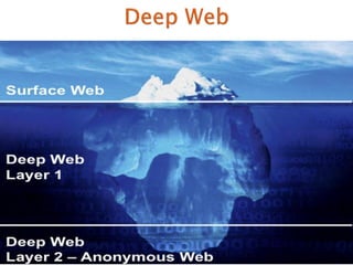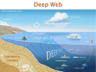 O documento discute a Deep Web, incluindo seus nomes alternativos, como funciona, sites disponíveis e riscos associados à navegação. Ele também menciona o fechamento do site Silk Road pelo FBI e os riscos de vírus ao usar a Deep Web.