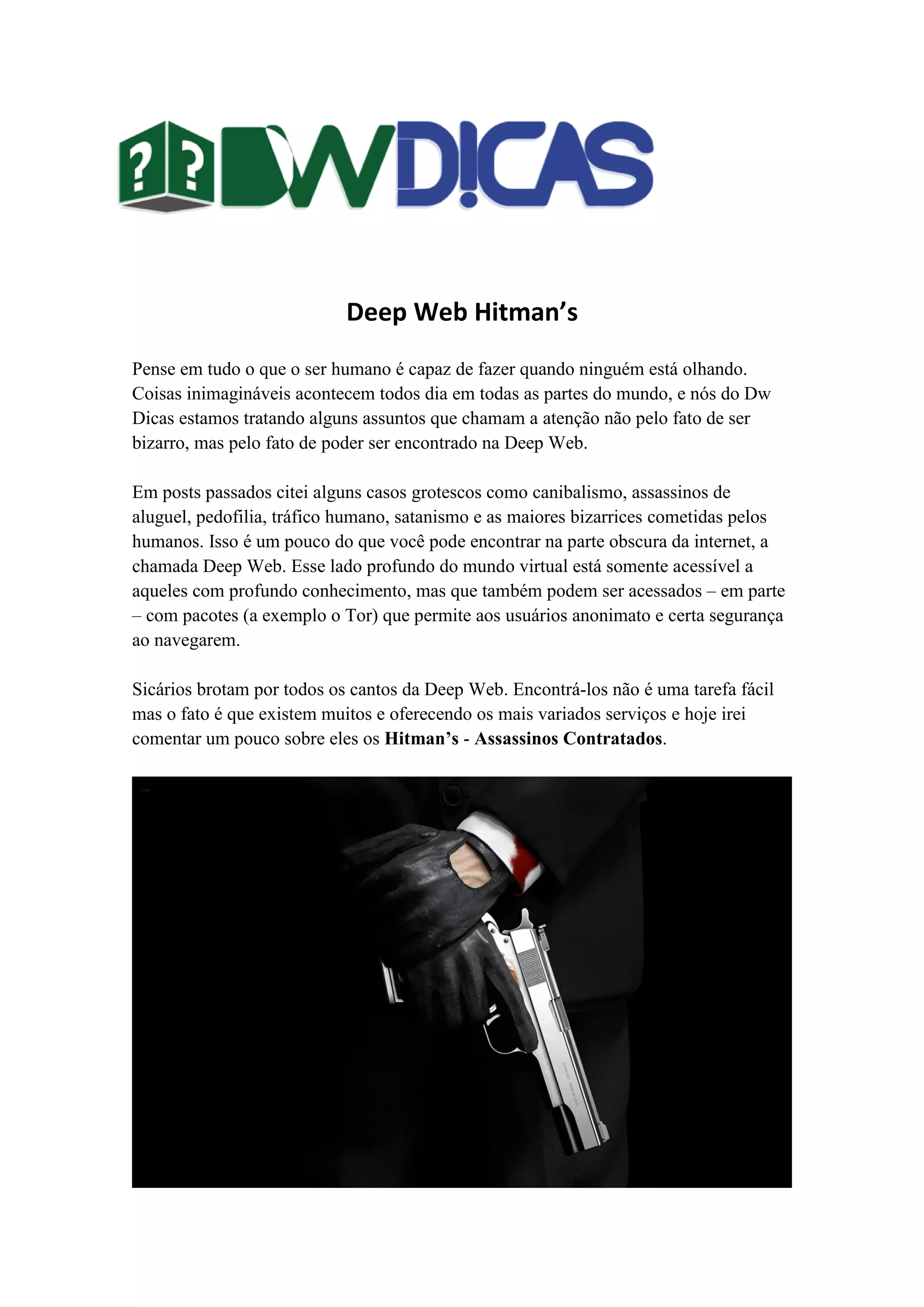 O documento descreve assassinos de aluguel ("hitmans") que oferecem seus serviços na Deep Web, com preços variando de acordo com a notoriedade e dificuldade do alvo. Muitos desses assassinos são da Europa Central e Ásia e poucos foram descobertos e presos. O conteúdo exato das camadas mais profundas da Deep Web permanece um mistério.
