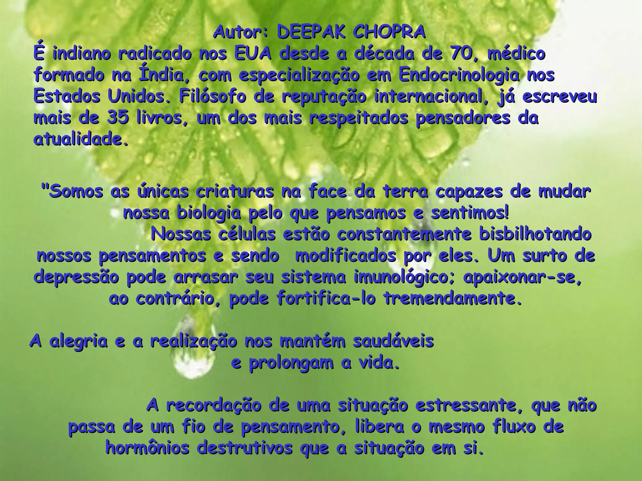 Deepak Chopra é um médico e filósofo indiano radicado nos EUA. Ele acredita que nossos pensamentos e emoções podem modificar nossa biologia e que a alegria e realização nos mantêm saudáveis. Nossas células processam nossas experiências de acordo com nossas perspectivas pessoais, então devemos usar a consciência para criar os corpos que desejamos.
