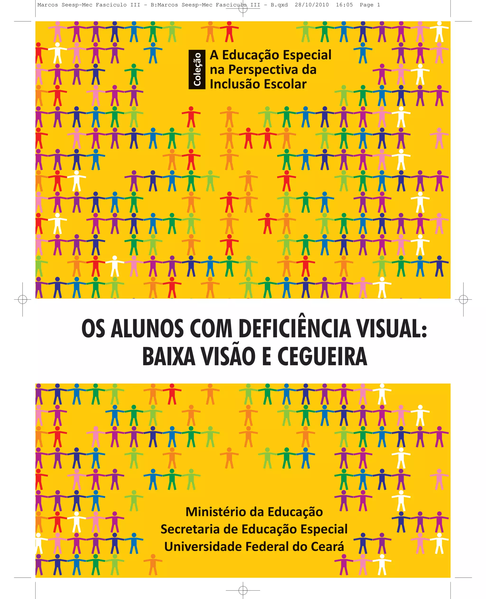 O documento discute as características e necessidades educacionais de alunos com baixa visão e cegueira. A primeira parte foca na baixa visão, definindo-a e discutindo recursos de acessibilidade ópticos e não-ópticos para esses alunos. A segunda parte trata da cegueira, abordando mitos, tipos de cegueira, formação de conceitos e alfabetização de alunos cegos. O texto fornece informações importantes para professores promoverem a inclusão escolar desses estudantes.