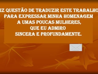 Este poema descreve a criação da mulher por Deus. No sexto dia, Deus criou a mulher apesar das dúvidas de um anjo sobre sua complexidade. A mulher foi projetada para ser forte e capaz de suportar muitas responsabilidades, embora também tenha suavidade através das lágrimas. No final, o poema elogia a força e o amor das mulheres, mas aponta que seu único defeito é esquecerem o próprio valor.