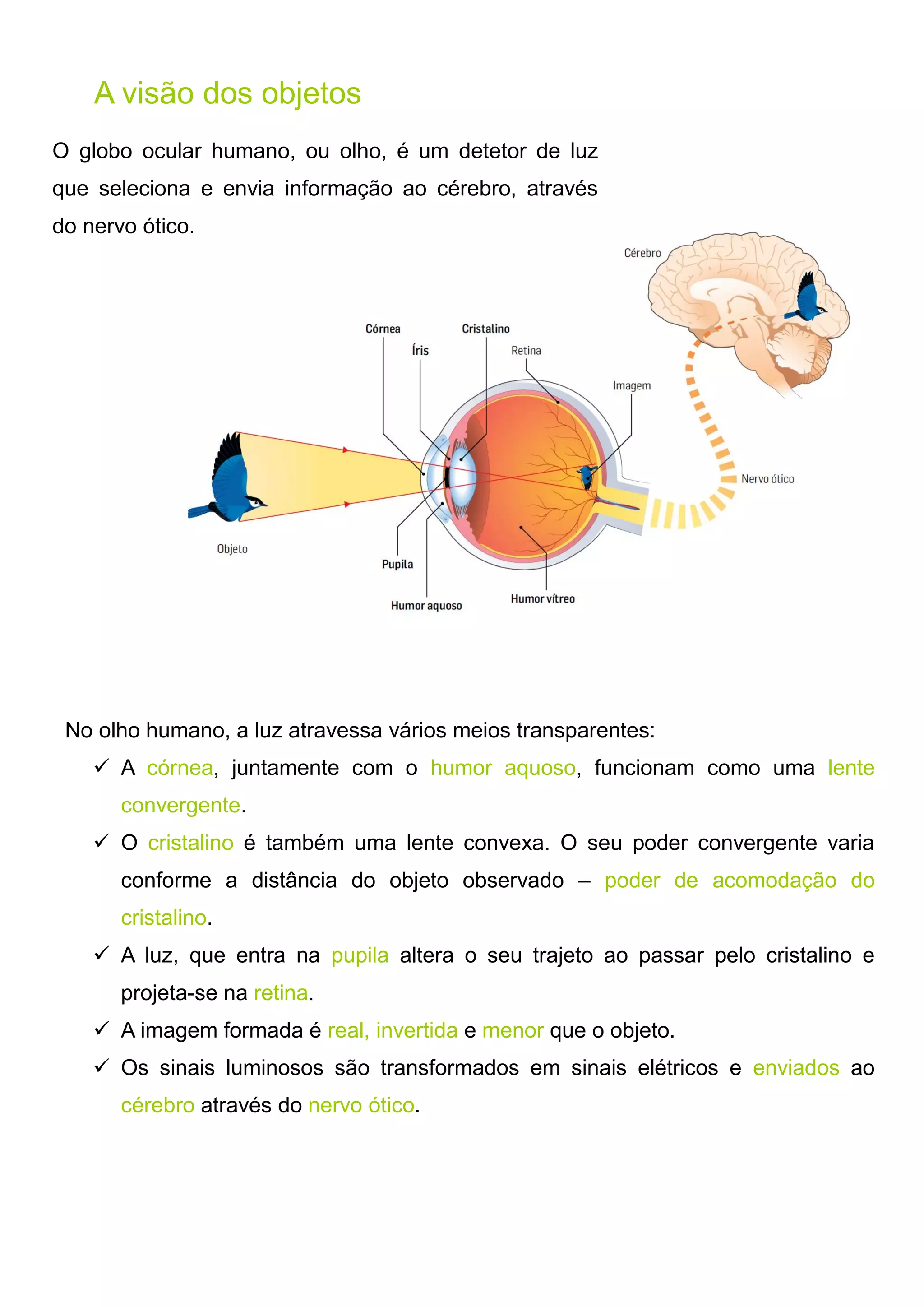 O olho humano permite a visão ao captar a luz, transformá-la em sinais elétricos no nervo óptico e enviá-los ao cérebro. A luz atravessa a córnea e o cristalino, que formam uma imagem invertida e menor na retina, antes de ser processada pelo cérebro. Defeitos de visão como miopia e hipermetropia ocorrem quando a imagem é formada fora da retina, podendo ser corrigidos com lentes convergentes ou divergentes, respectivamente.