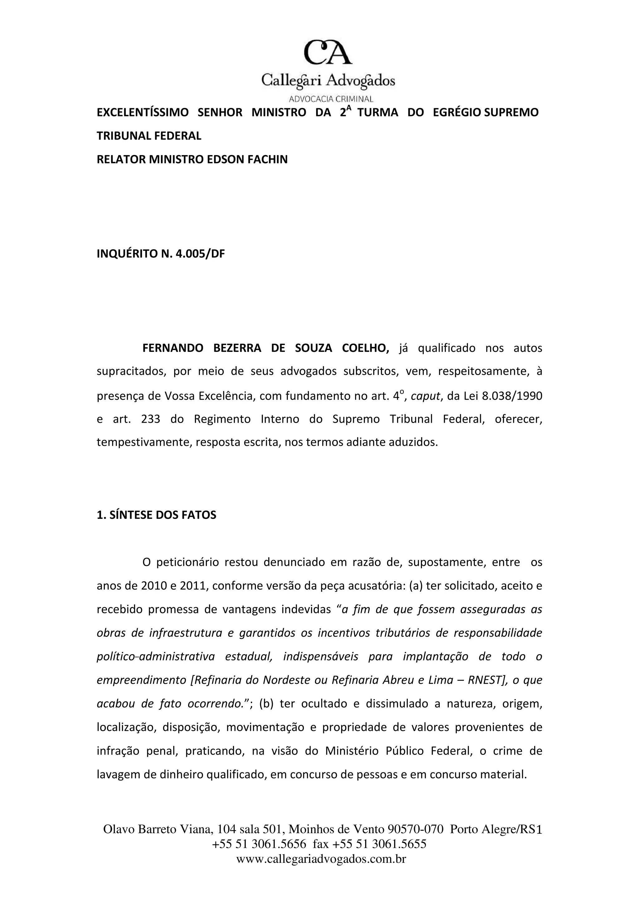O documento apresenta a defesa de Fernando Bezerra de Souza Coelho em resposta a uma denúncia no inquérito n. 4.005/DF, acusando-o de receber vantagens indevidas relacionadas à refinaria do Nordeste. A defesa argumenta que a denúncia é inepta por carecer de uma narrativa clara e objetiva sobre os atos praticados pelo acusado, não apresentando indícios suficientes que sustentem as acusações de corrupção e lavagem de dinheiro. Recomenda-se a rejeição da acusação, uma vez que a fundamentação se baseia apenas em delações contraditórias e sem comprovações materiais.