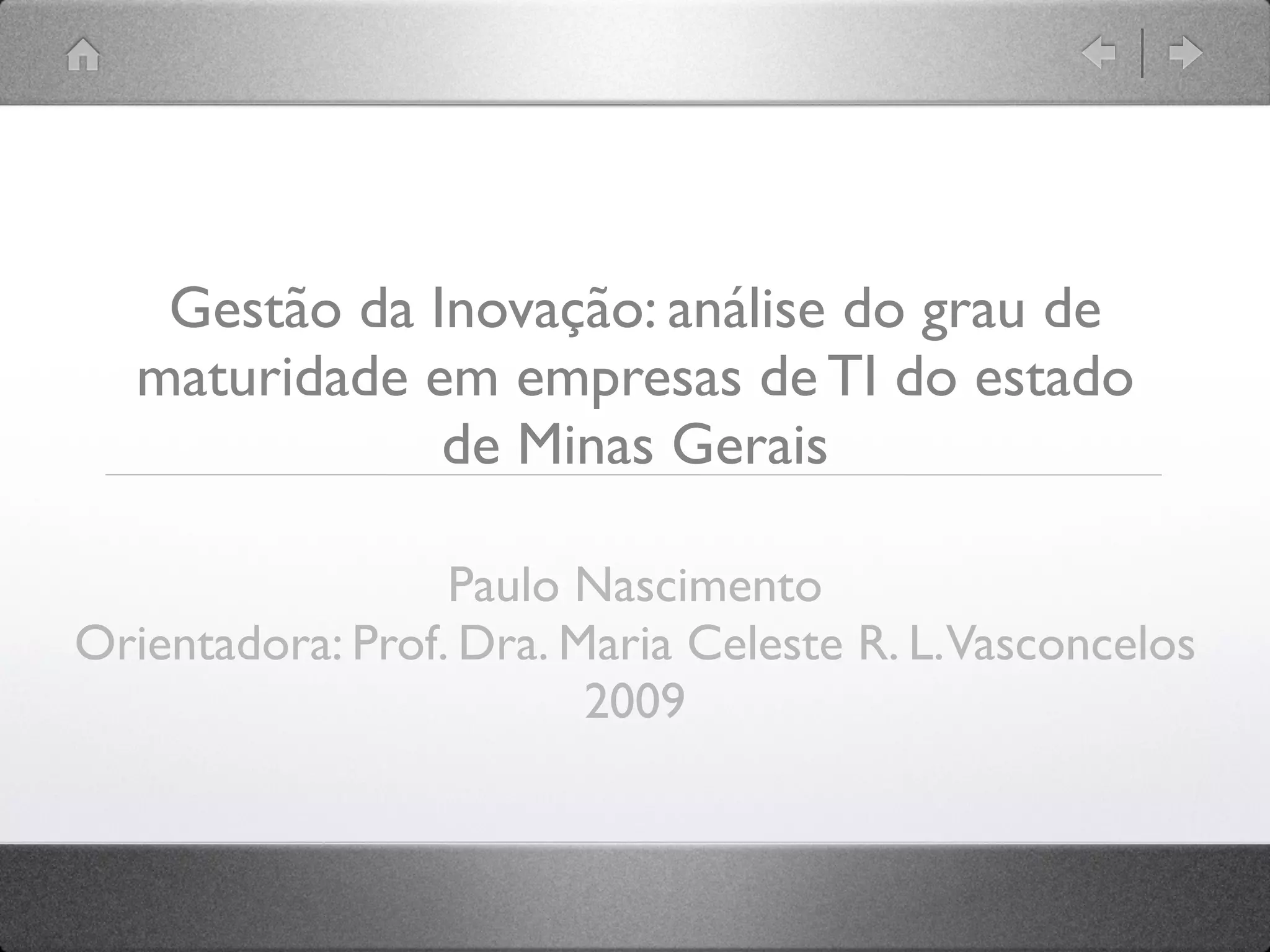 Este documento apresenta os resultados de uma pesquisa sobre o grau de maturidade em gestão da inovação em empresas de TI de Minas Gerais. A maioria das empresas pesquisadas (71,7%) foram classificadas como medianamente inovadoras, enquanto 15,1% foram consideradas inovadoras e 13,2% pouco inovadoras. Os resultados indicam que as empresas precisam melhorar investimentos em inovação, parcerias e ouvir mais os clientes. Sugestões para futuros estudos incluem aplicar a pesquisa em outros portes de empresas e foc