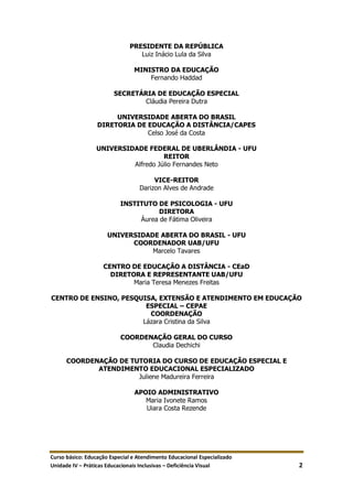 1. O documento discute práticas educacionais inclusivas para alunos com deficiência visual, abordando temas como comunicação, avaliação funcional e uso de recursos tecnológicos no atendimento educacional especializado.