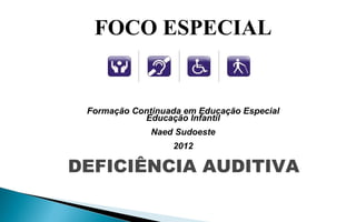 O documento fornece informações sobre deficiência auditiva, incluindo causas, níveis de perda auditiva, LIBRAS e orientações para educação bilíngue de surdos.