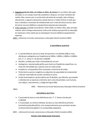 O documento define e descreve vários tipos de deficiência, incluindo deficiência mental, visual, auditiva, múltipla e mobilidade reduzida. Deficiência mental é caracterizada por funcionamento intelectual abaixo da média com limitações em duas ou mais áreas adaptativas antes dos 18 anos. Deficiência visual inclui cegueira, baixa visão e campo visual reduzido. Deficiência auditiva é perda parcial ou total de audição acima de 41dB. Deficiência múltipla envolve duas ou mais deficiências primárias. Mobilidade redu