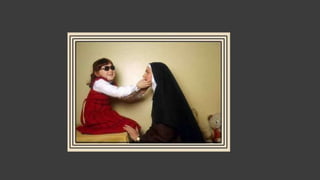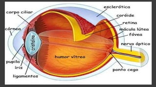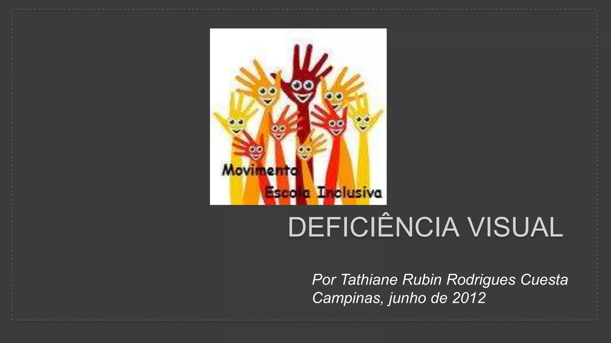 O documento discute a visão e deficiência visual. Aprendemos a ver através das imagens captadas pelos olhos e enviadas ao cérebro. Problemas de desenvolvimento ou doenças podem causar cegueira total ou baixa visão. O sistema Braille foi criado para que cegos possam ler e escrever usando o toque.