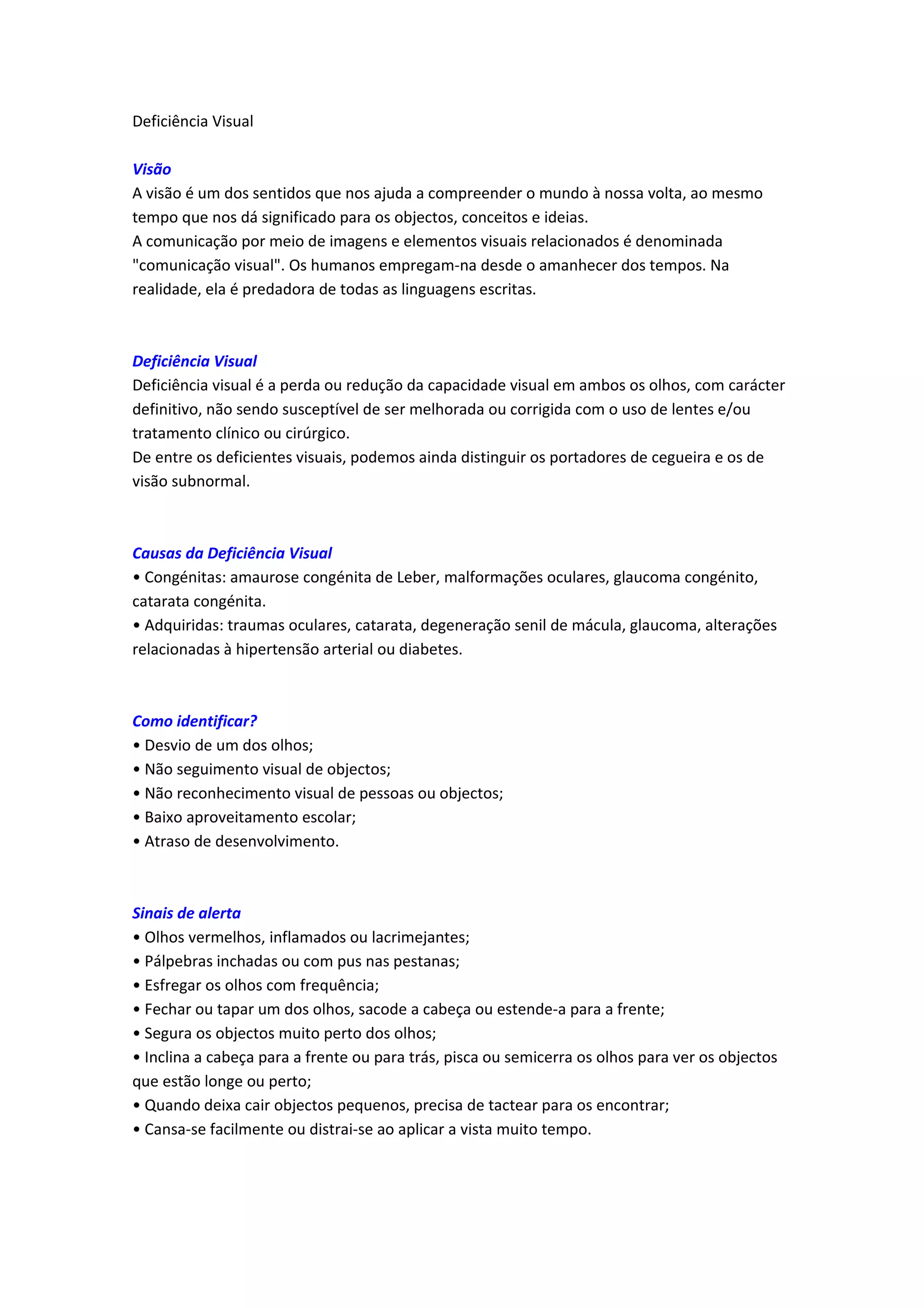 O documento discute deficiência visual, incluindo suas causas, sinais, consequências e abordagens educacionais. A deficiência visual é a perda ou redução da capacidade visual que não pode ser corrigida. Pode ser congênita ou adquirida e causa dificuldades visuais. Crianças com deficiência visual precisam de estimulação sensorial e adaptações educacionais individuais para se desenvolverem adequadamente.