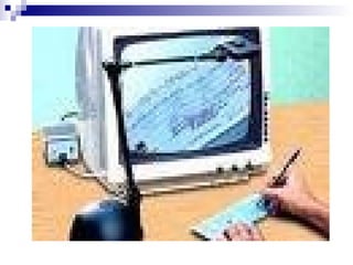 O documento discute as tecnologias e ferramentas que podem auxiliar pessoas com deficiência visual em suas vidas diárias, estudos e lazer. Ele lista vários programas e softwares desenvolvidos para esse fim, como leitores de tela, ampliadores de imagem, sintetizadores de voz e editores de texto em Braille. Também menciona adaptações como mouses, teclados e calculadoras especiais para cegos.