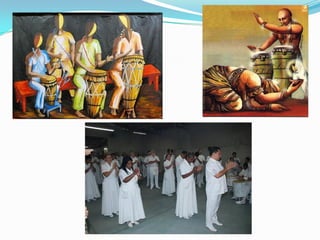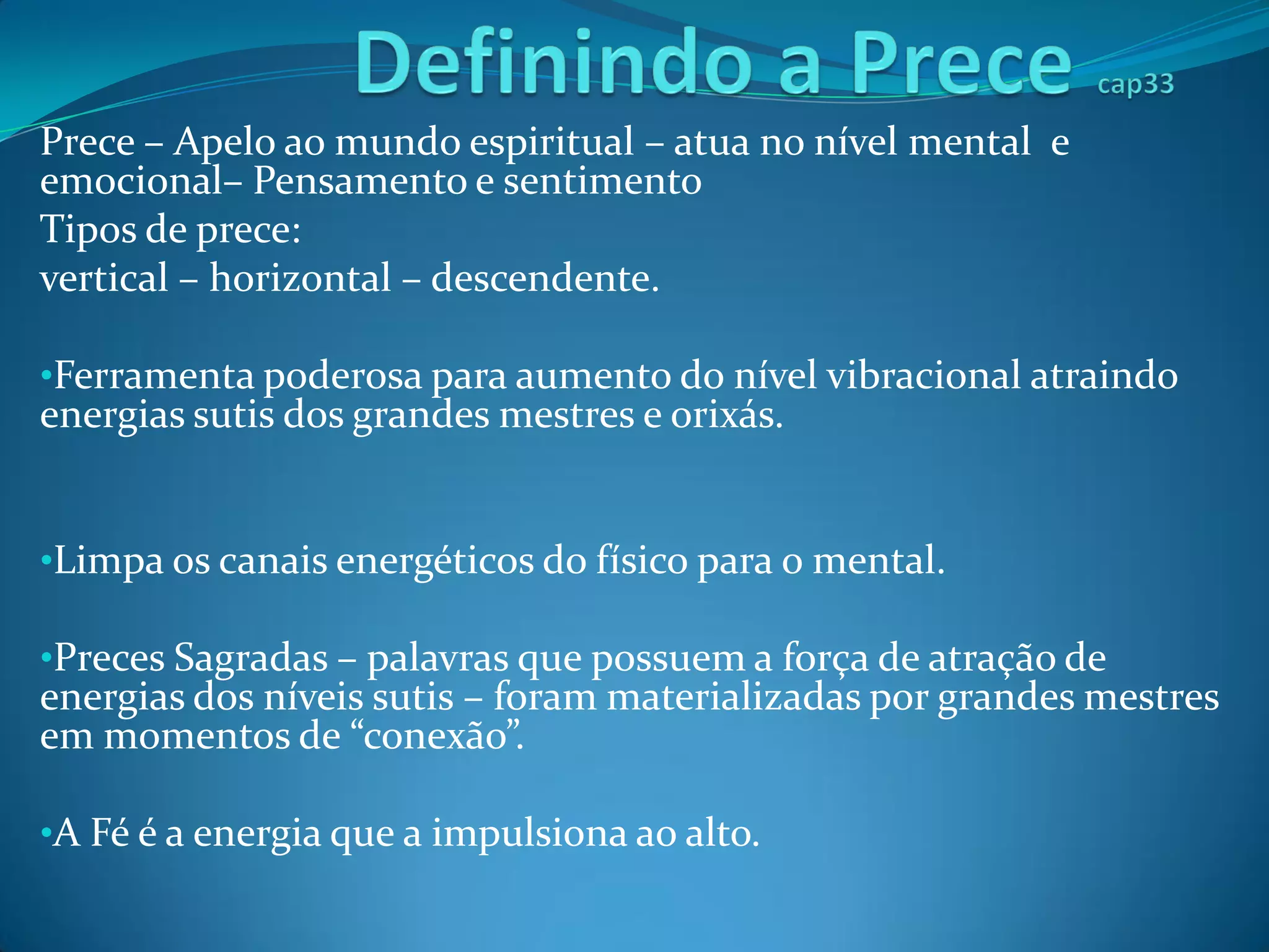 O documento discute o poder do som e da música para elevar a vibração e atrair energias espirituais. Apresenta os tipos de prece e explica que a curimba é usada na Umbanda para abrir e fechar trabalhos, atraindo as linhas dos orixás através da força da vibração sonora. Também destaca a importância do som para a cura física e espiritual.