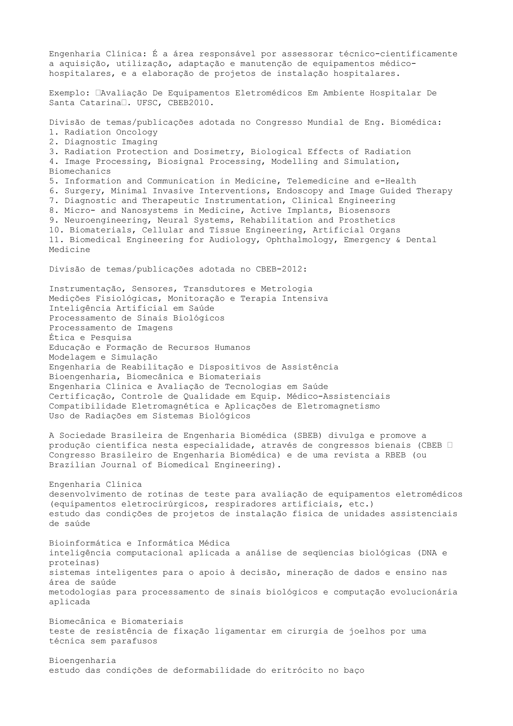 O documento discute engenharia clínica e biomédica, incluindo a avaliação de equipamentos médicos, instalações hospitalares e as divisões de temas em congressos. Também menciona associações como a ABIMO e ABIMED que representam a indústria médica no Brasil.
