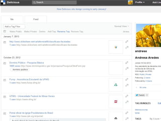 O documento resume uma avaliação da rede social Delicious quanto à sua arquitetura da informação, usabilidade e acessibilidade. A avaliação utilizou inspeção por heurísticas para arquitetura da informação e usabilidade, e as diretrizes WCAG 2.0 para acessibilidade. Conclui-se que o Delicious atende bem aos critérios, com pequenas falhas na rotulação e busca.