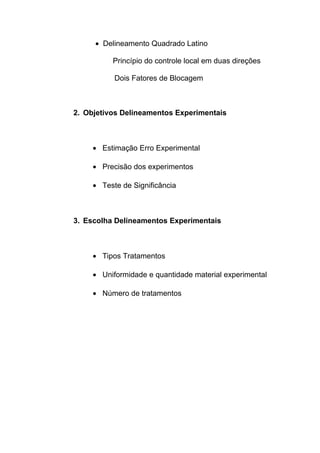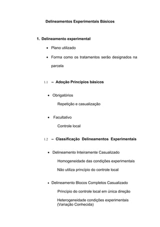 Este documento discute os delineamentos experimentais básicos. Apresenta os principais tipos de delineamentos como o inteiramente casualizado, blocos completos casualizados e quadrado latino, destacando seus princípios, vantagens e desvantagens. Também aborda a importância da casualização, estimativa do erro experimental e escolha do delineamento adequado de acordo com os objetivos e características do experimento.