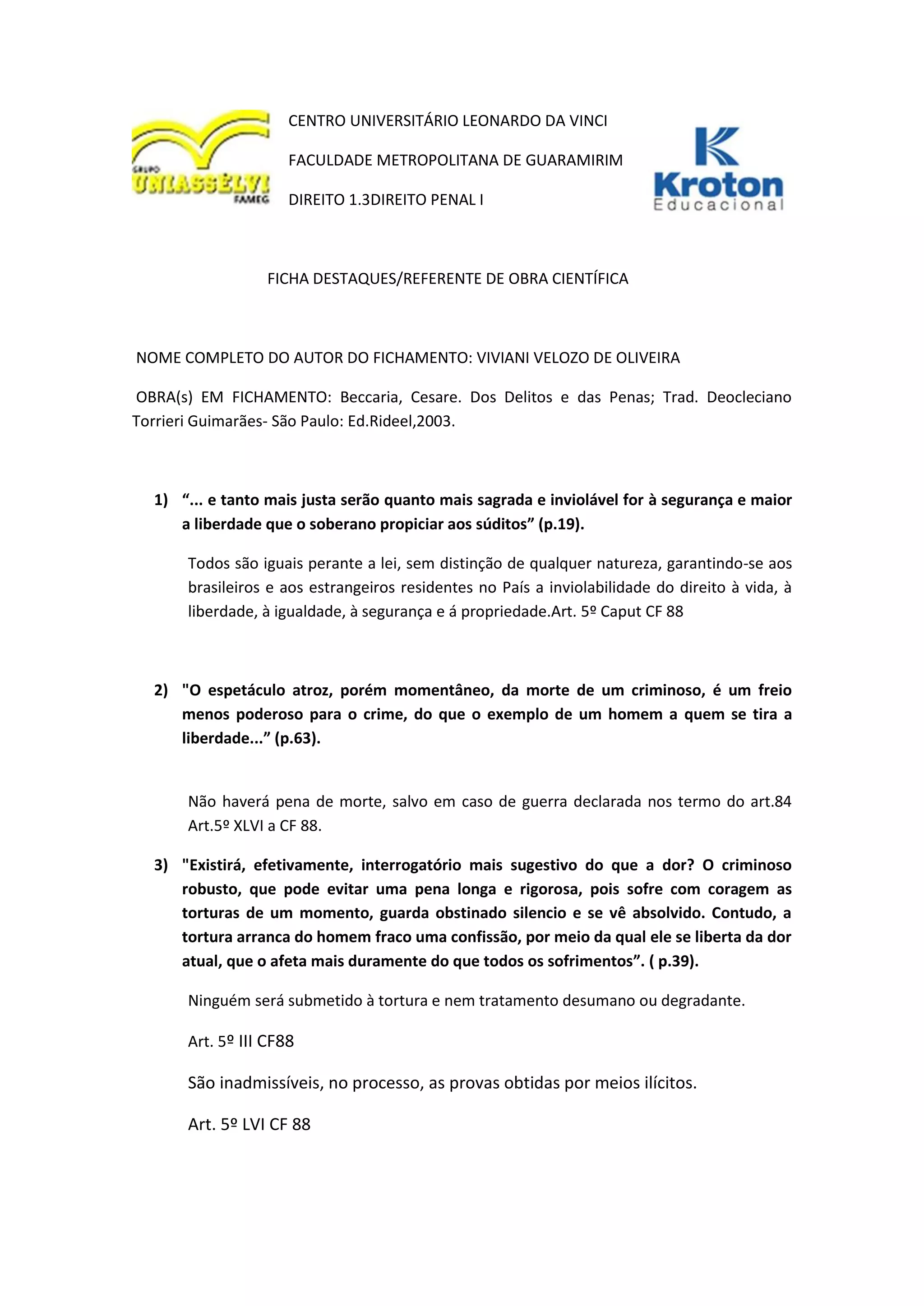 O documento resume 11 pontos principais do livro "Dos Delitos e das Penas" de Cesare Beccaria. Os pontos destacam princípios como igualdade perante a lei, proporcionalidade da pena, presunção de inocência e proibição de pena de morte e tortura, que influenciaram a formação do direito penal brasileiro.