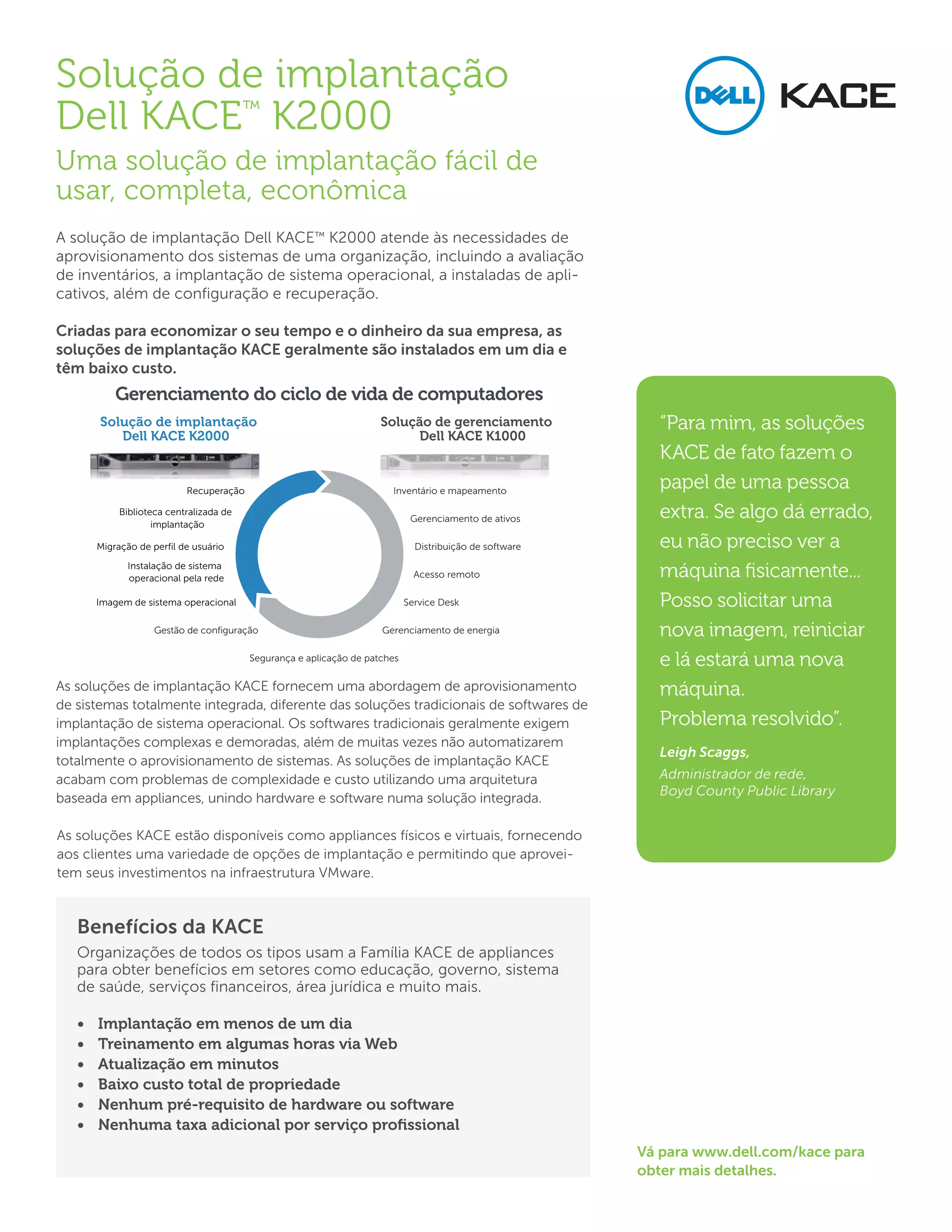 A solução de implantação Dell KACE K2000 permite a implantação de sistemas de forma rápida e econômica através da geração automatizada de imagens, instalação remota de sistemas operacionais e aplicativos, e recuperação de computadores. Ela oferece funcionalidades como inventário de hardware, migração de perfis de usuário, gerenciamento de drivers e implantação remota para vários locais.