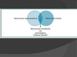 O documento discute os conceitos de regime político e democracia. Ele define regime político como o conjunto de instituições por meio das quais um estado exerce seu poder sobre a sociedade. Democracia é definida como um regime no qual todos os cidadãos participam igualmente no processo político, através do sufrágio universal. O documento também discute as formas de democracia direta, indireta e semidireta.