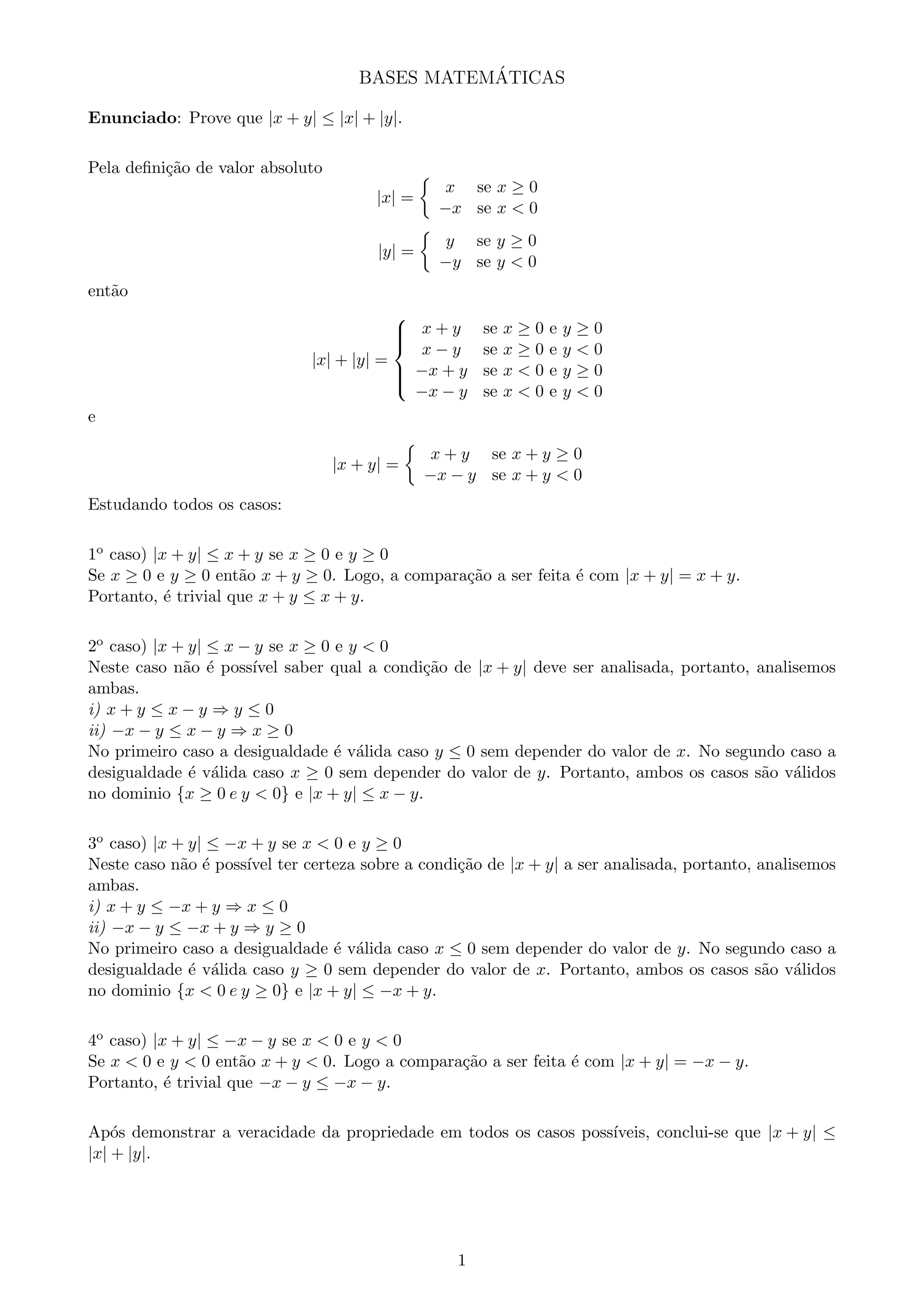 A prova analisa quatro casos possíveis para os sinais de x e y e demonstra que em todos eles a desigualdade |x + y| ≤ |x| + |y| é válida. Uma segunda forma de prova nota que |x| ≥ x, |y| ≥ y e |x + y| é igual ao maior entre x + y e -(x + y), o que implica que |x| + |y| ≥ |x + y|. Portanto, a desigualdade é verdadeira para qualquer valor de x e y.