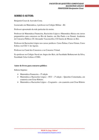 1. O documento apresenta um pacote de questões comentadas de raciocínio lógico de autoria do professor Benjamin César;
