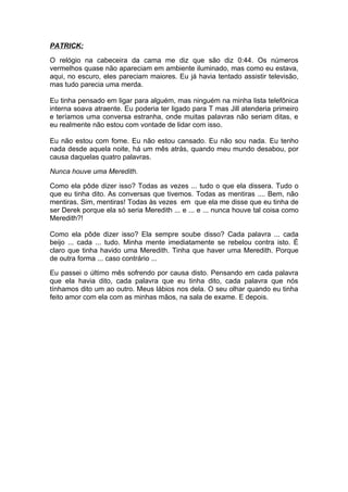 Patrick bate na porta do quarto de hotel de Ellen à meia-noite, incerto do que dizer. Ele revela que nunca houve um Derek e que sempre sentiu algo por Ellen, não Meredith. Ellen fica confusa mas o deixa entrar. Patrick diz que só importa como se sente sobre ela, não sobre personagens.