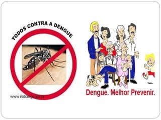 O documento discute a dengue, incluindo suas características, agente causador, vetores, ciclo de transmissão, sintomas, diagnóstico e tratamento. Ele também aborda a definição de caso suspeito, classificação da febre hemorrágica da dengue, controle vetorial e educação em saúde sobre a doença.