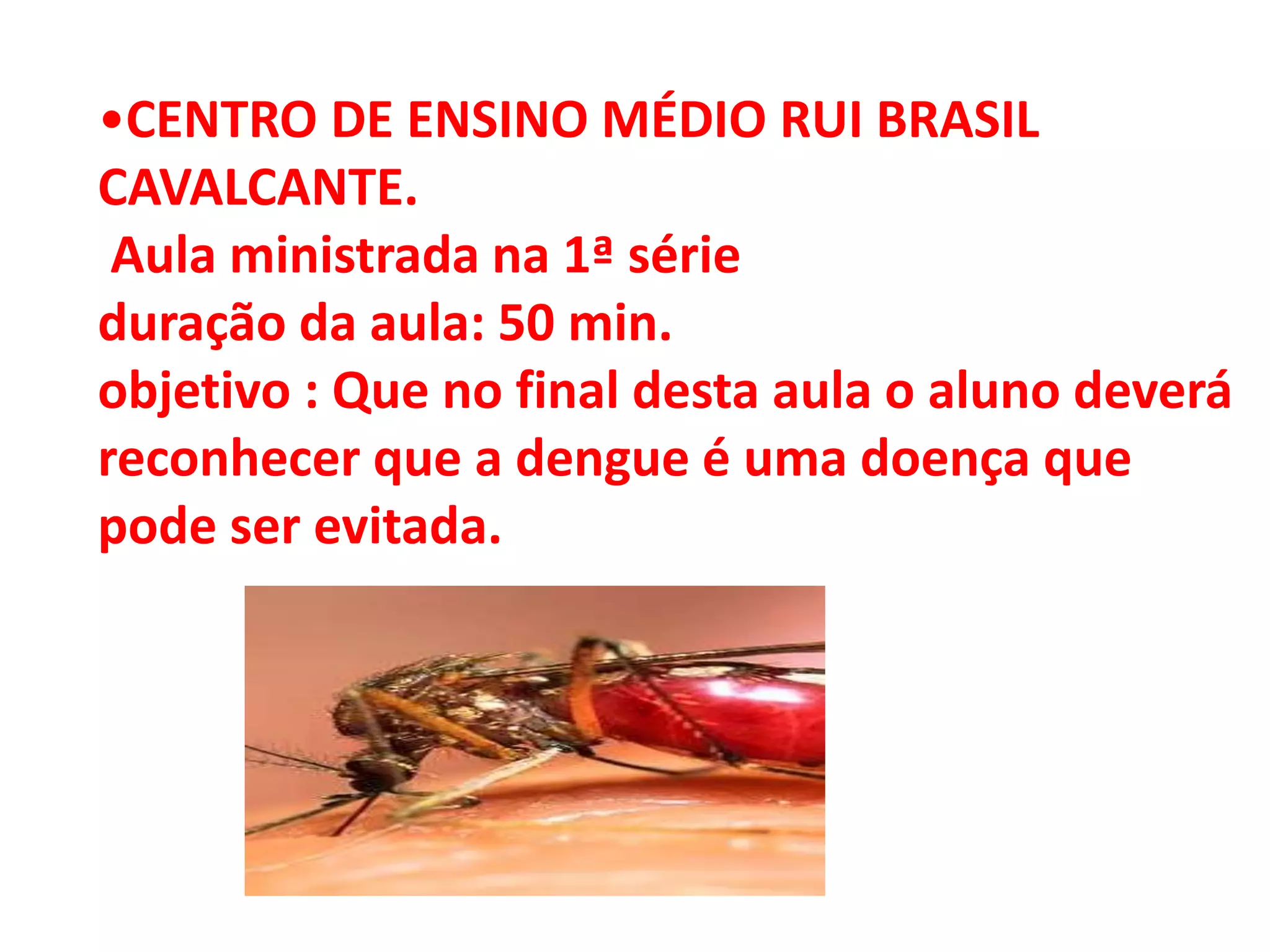 O documento discute a dengue, uma doença infecciosa transmitida pelo mosquito Aedes aegypti. Existem quatro tipos de vírus da dengue, e a doença pode variar de leve a grave, causando febre, dor e hemorragia. A prevenção envolve eliminar locais com água parada e usar repelentes, já que o mosquito se reproduz nesses locais.