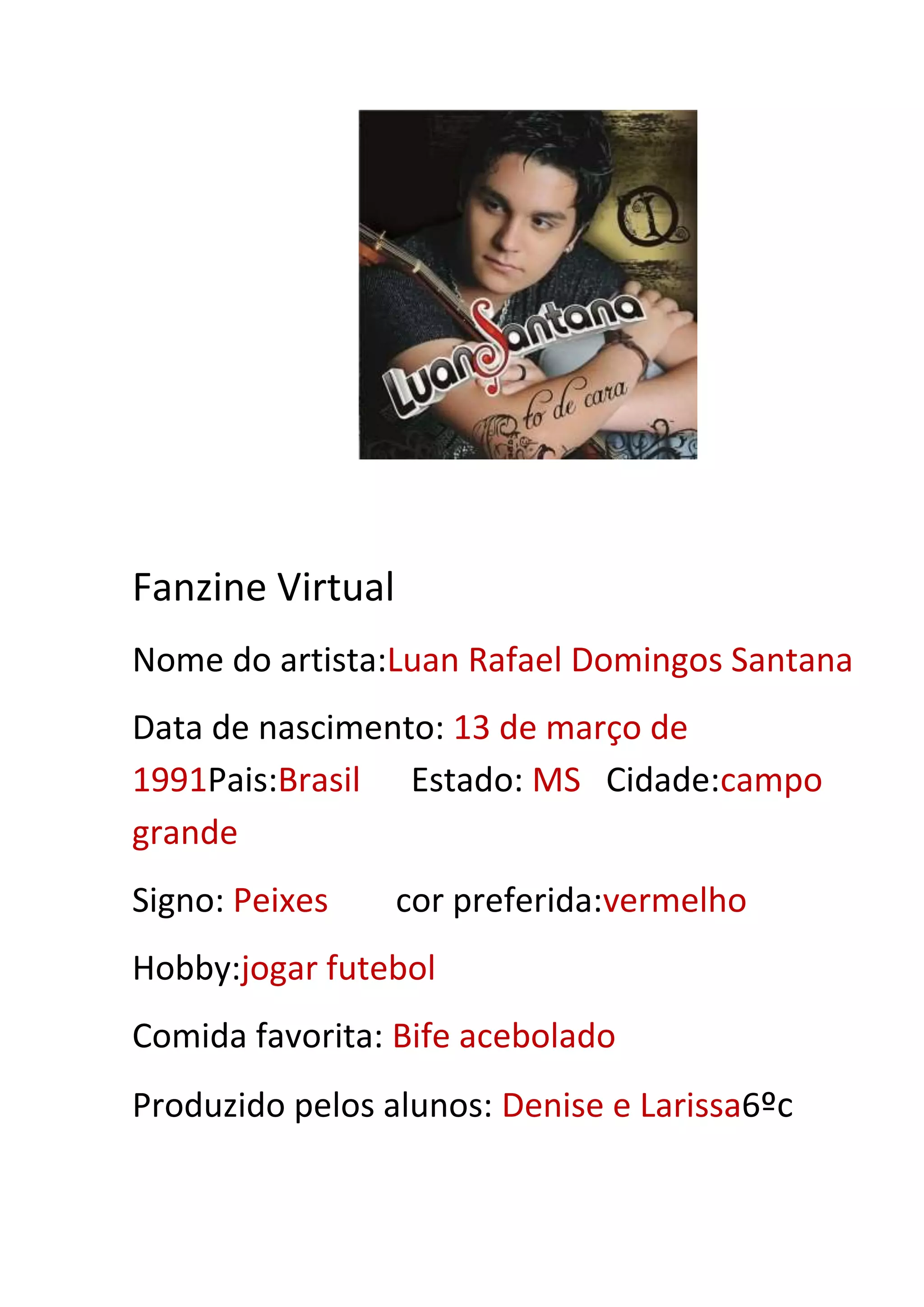 O artista Luan Rafael Domingos Santana nasceu em 13 de março de 1991 em Campo Grande, Mato Grosso do Sul, Brasil. Ele gosta de jogar futebol e seu prato favorito é bife acebolado.