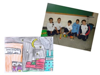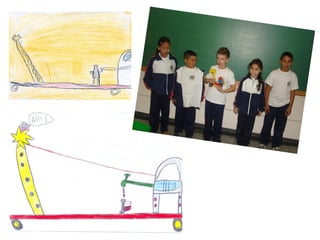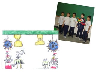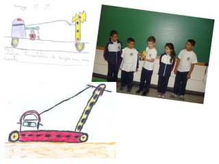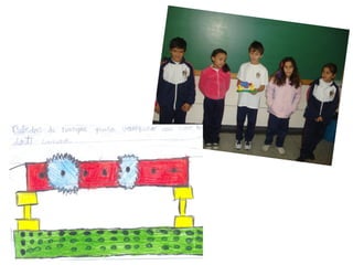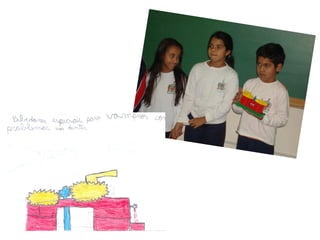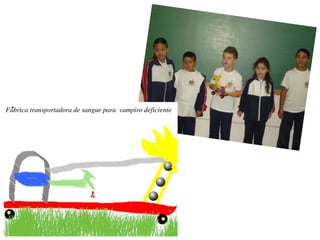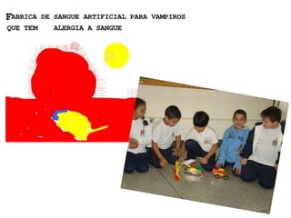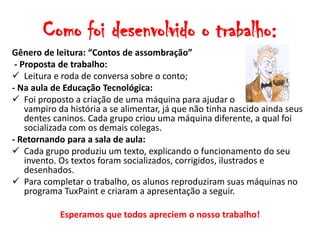 O documento descreve um projeto desenvolvido por alunos do 3º ano A da EMEB José Cataldi que envolveu a leitura de contos de assombração e a criação de máquinas inventivas para ajudar vampiros sem dentes caninos a se alimentar. Os alunos trabalharam em grupos, criando protótipos e textos explicativos, utilizando a criatividade e a tecnologia na educação. O trabalho foi bem recebido, destacando a diversão e o aprendizado em equipe.
