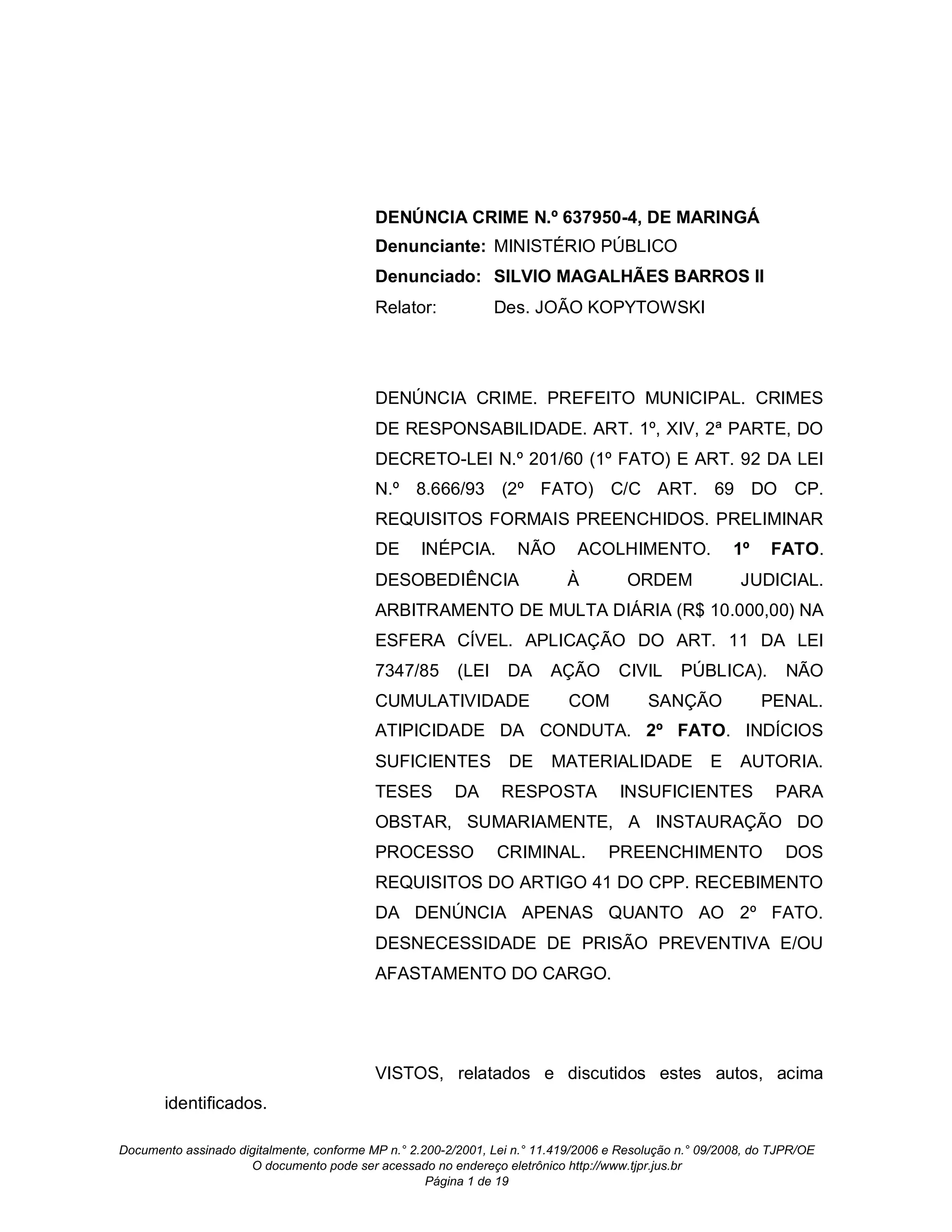 O documento descreve uma denúncia criminal contra o prefeito de Maringá, Silvio Magalhães Barros II, por dois fatos: (1) desobediência a uma ordem judicial para encerrar o lixão municipal e recuperar a área, e (2) modificações irregulares em contrato para recuperação ambiental do lixão, causando prejuízo ao município. O promotor pede o recebimento da denúncia pelo segundo fato, mas não pela primeira alegando atipicidade da conduta.