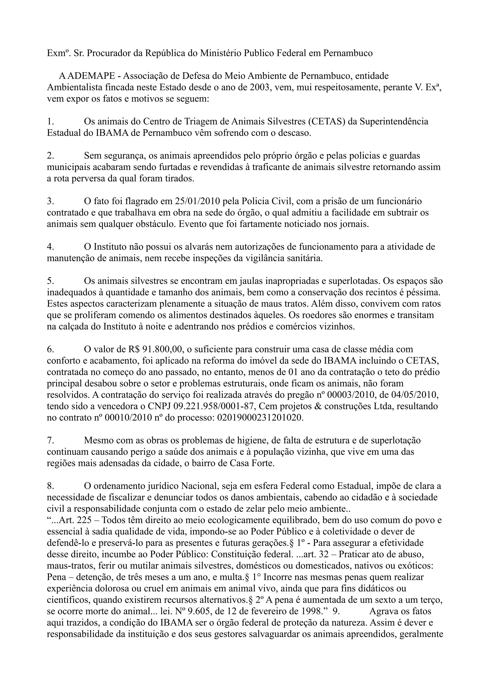 1) Uma associação ambientalista denuncia maus-tratos de animais no Centro de Triagem de Animais Silvestres do IBAMA em Pernambuco, incluindo superlotação, jaulas inadequadas e falta de segurança, levando ao furto dos animais.
