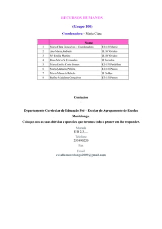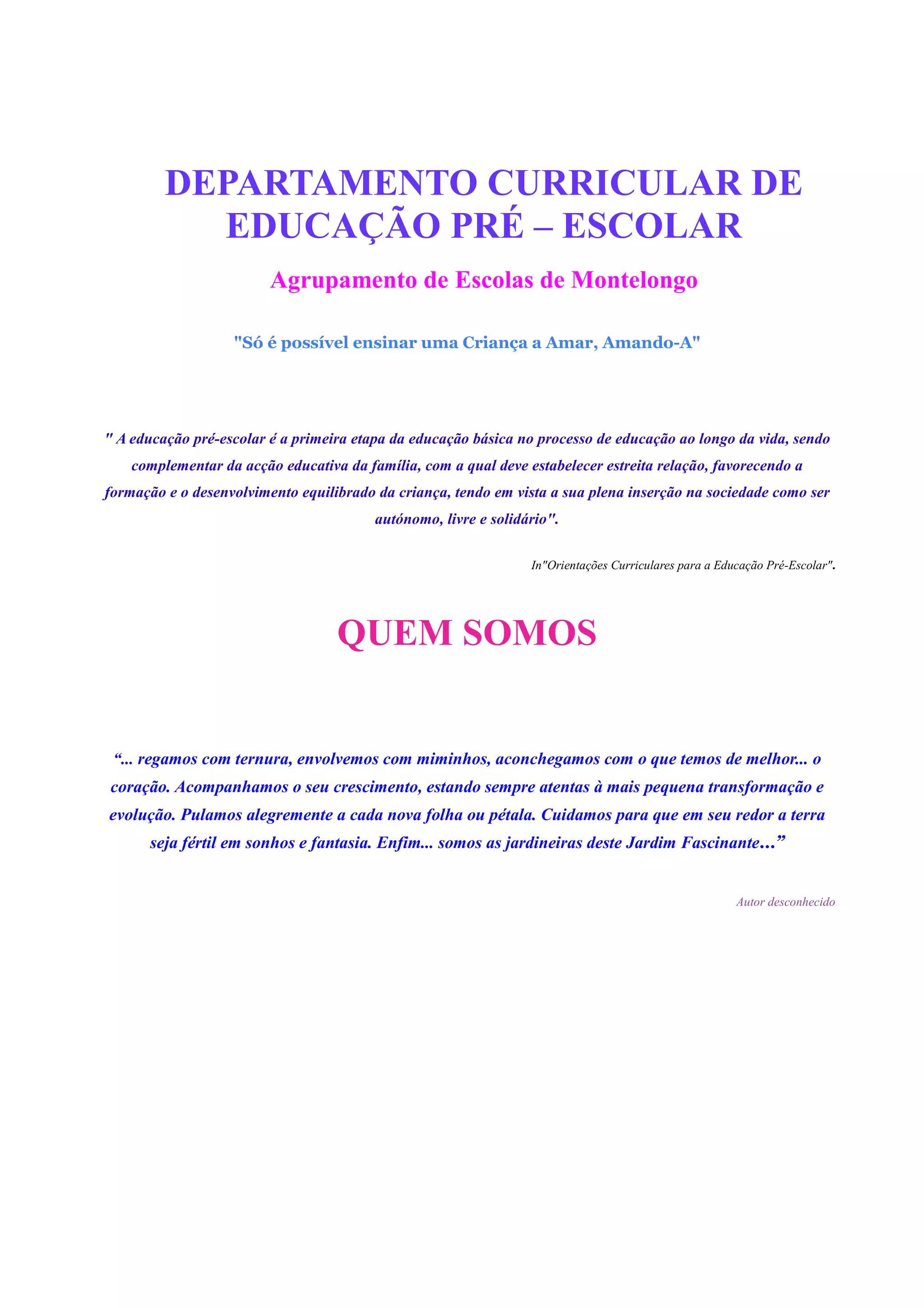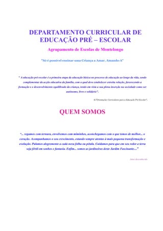Este documento fornece informações sobre o Departamento Curricular de Educação Pré-Escolar do Agrupamento de Escolas de Montelongo. Apresenta a missão e objetivos da educação pré-escolar, lista os recursos humanos e locais, e fornece contatos e recursos para educadores, incluindo textos de apoio sobre vários tópicos curriculares.