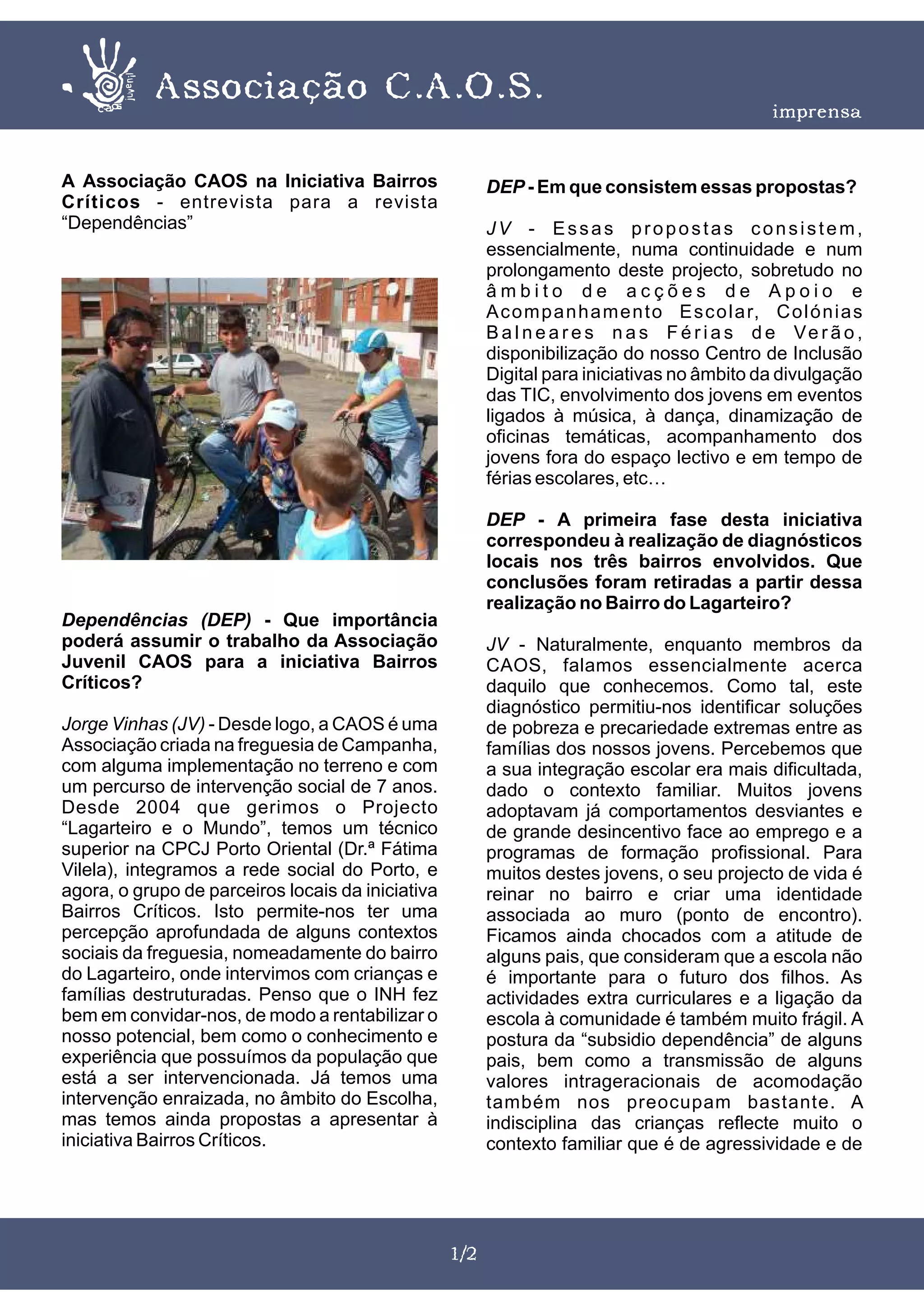 O documento descreve uma entrevista com Jorge Vinhas da Associação Juvenil CAOS sobre o seu trabalho na iniciativa Bairros Críticos no Bairro do Lagarteiro. O diagnóstico revelou pobreza e problemas familiares entre os jovens, dificultando a integração escolar. A CAOS pretende oferecer oportunidades de participação para elevar a auto-estima dos jovens.