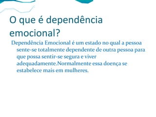 A dependência emocional ocorre quando uma pessoa sente que precisa de outra para se sentir segura e viver bem. Pessoas dependentes emocionalmente são ciumentas, possessivas e exigem atenção exclusiva, além de terem baixa autoestima e dificuldade em aceitar a maturidade nos relacionamentos. A dependência emocional surge de rejeições reais ou imaginárias no passado e é mantida por meio de manipulação e controle sobre a outra pessoa.