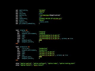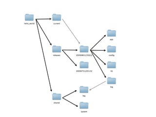 O documento discute estratégias para implantar aplicações Rails em produção, incluindo o uso de ferramentas como Capistrano para automatizar o processo de implantação, configurar tarefas cron e migrar bancos de dados, bem como opções de servidores como Apache + Passenger, Mongrels ou servidores Java.