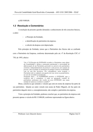 Este documento contém 10 questões de uma prova de contabilidade geral resolvida e comentada. A primeira questão trata do princípio da entidade e depreciação de veículos. As questões subsequentes abordam tópicos como definição de débito e crédito, método de custo médio para estoque, cálculo de depreciação de veículos e classificação de contas.