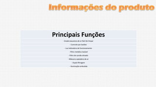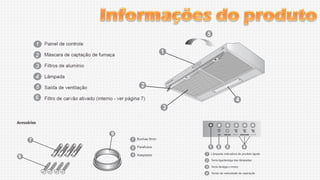 O depurador de ar Electrolux DE60B possui filtros metálico e de carvão ativado para filtrar a gordura e odores, respectivamente. Ele pode ser instalado em baixo de um armário ou parede, entre 65-75 cm acima do fogão, e deve ser conectado à rede elétrica compatível antes do uso para remover fumaça e vapores da cozinha.