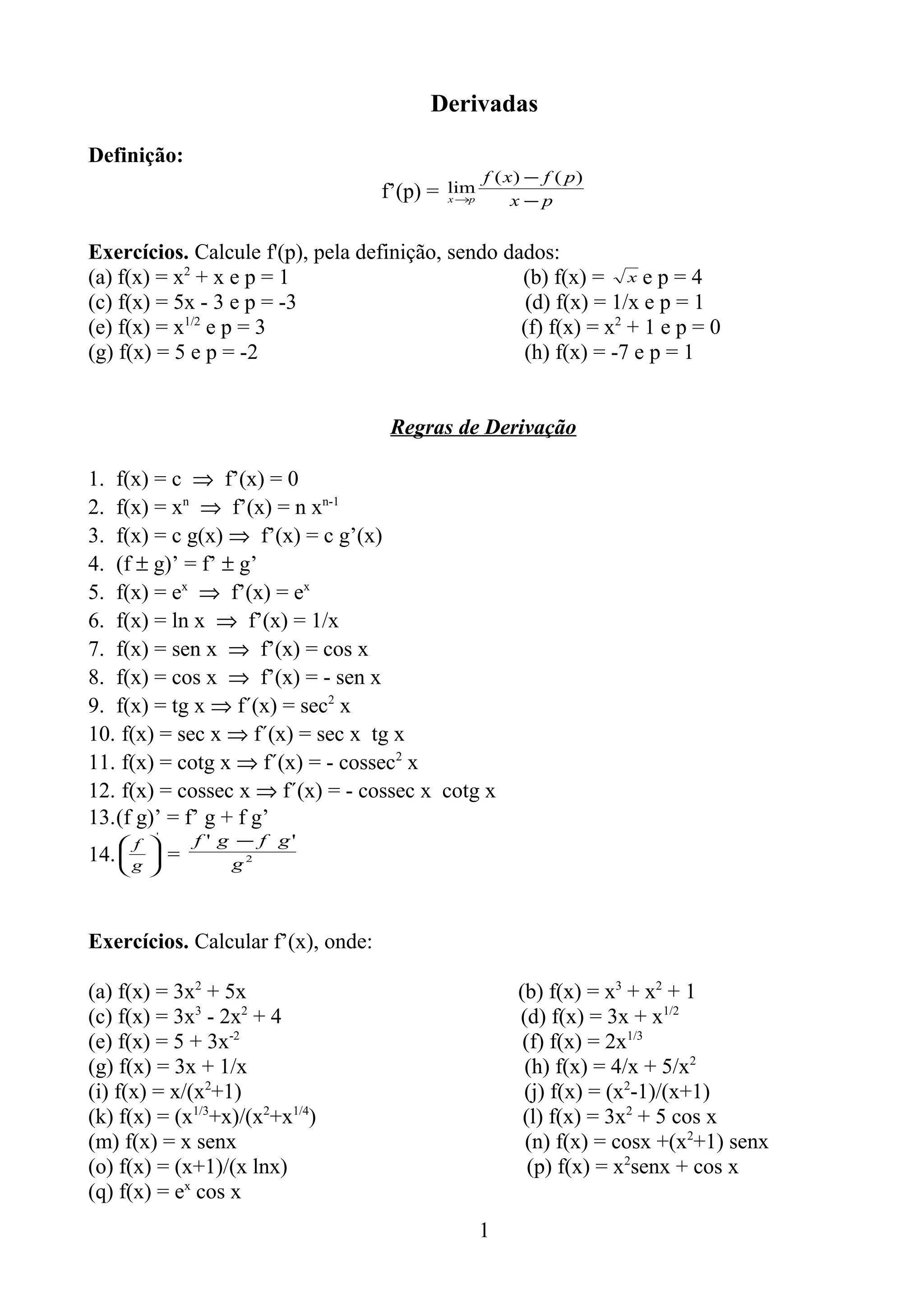 O documento apresenta definições e regras sobre derivadas de funções, incluindo: 1) a definição formal de derivada; 2) regras de derivação como derivadas de funções polinomiais, exponenciais, logarítmicas e trigonométricas; 3) derivadas de funções compostas; 4) derivadas implícitas. Também apresenta exercícios sobre o cálculo de derivadas em diferentes situações.