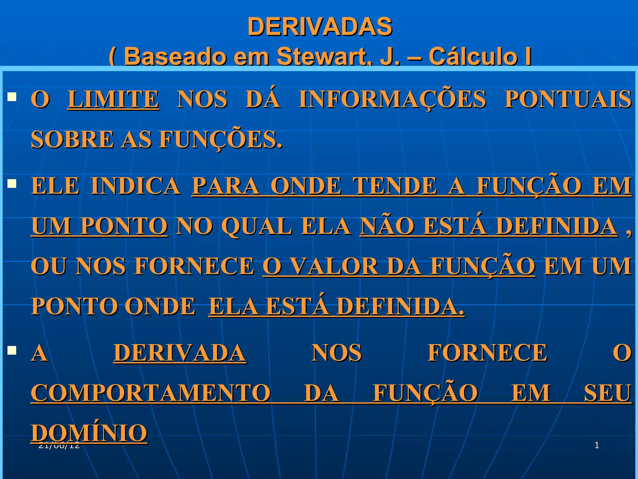 O documento discute conceitos fundamentais sobre derivadas, incluindo: (1) a derivada fornece informações sobre a taxa de variação instantânea de uma função; (2) a derivada de uma função f(x) no ponto x=a é definida como o limite da inclinação da reta tangente quando h tende a zero; (3) a derivada pode ser interpretada geometricamente como a inclinação da reta tangente ou algébricamente como uma função.