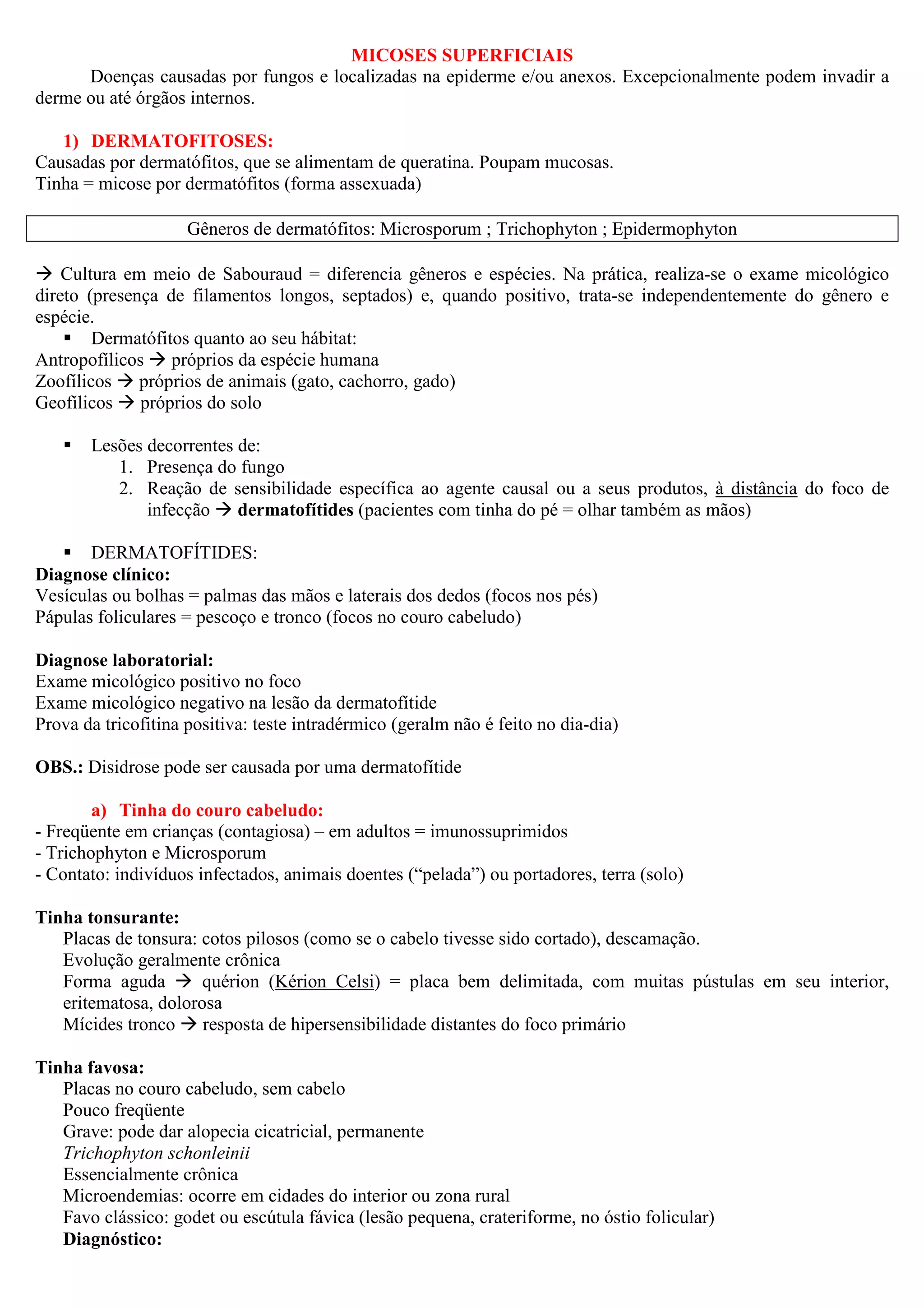 O documento descreve micose superficial causada por fungos que se localizam na epiderme, incluindo dermatofitoses causadas por dermatófitos que se alimentam de queratina e ceratofitoses causadas por fungos comensais que se alimentam de restos epiteliais. É detalhada a descrição clínica, diagnóstico e tratamento de diversas formas de tinhas e pitiríase versicolor.