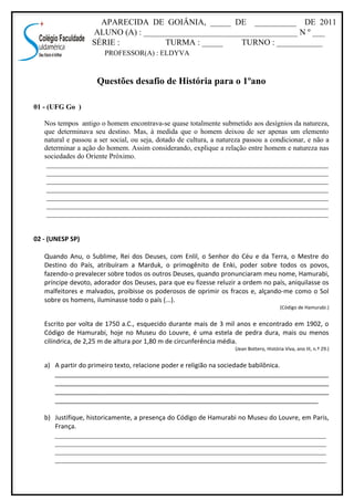O documento apresenta duas questões sobre história do Oriente Próximo para alunos do 1o ano. A primeira pergunta trata da relação entre homem e natureza nas sociedades do Oriente Próximo antigo, onde a natureza condicionava mais do que determinava as ações humanas. A segunda questão discute o Código de Hamurabi da Babilônia, que relacionava poder e religião e foi encontrado no século 20 em Paris depois de ter sido esquecido por mais de 3 mil anos.