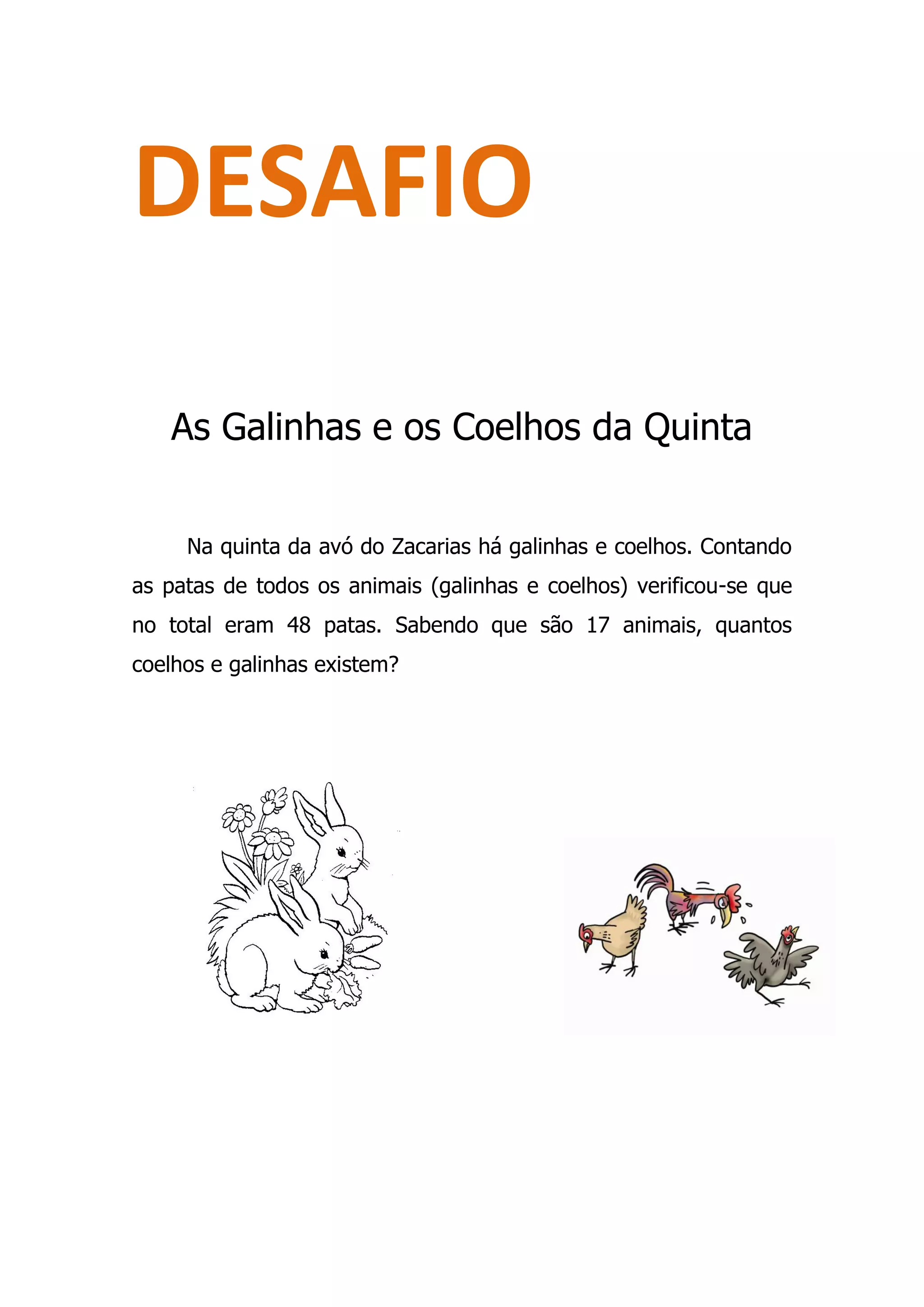 Na quinta da avó do Zacarias há galinhas e coelhos, com um total de 48 patas entre os 17 animais. O desafio é determinar quantas galinhas e coelhos existem.
