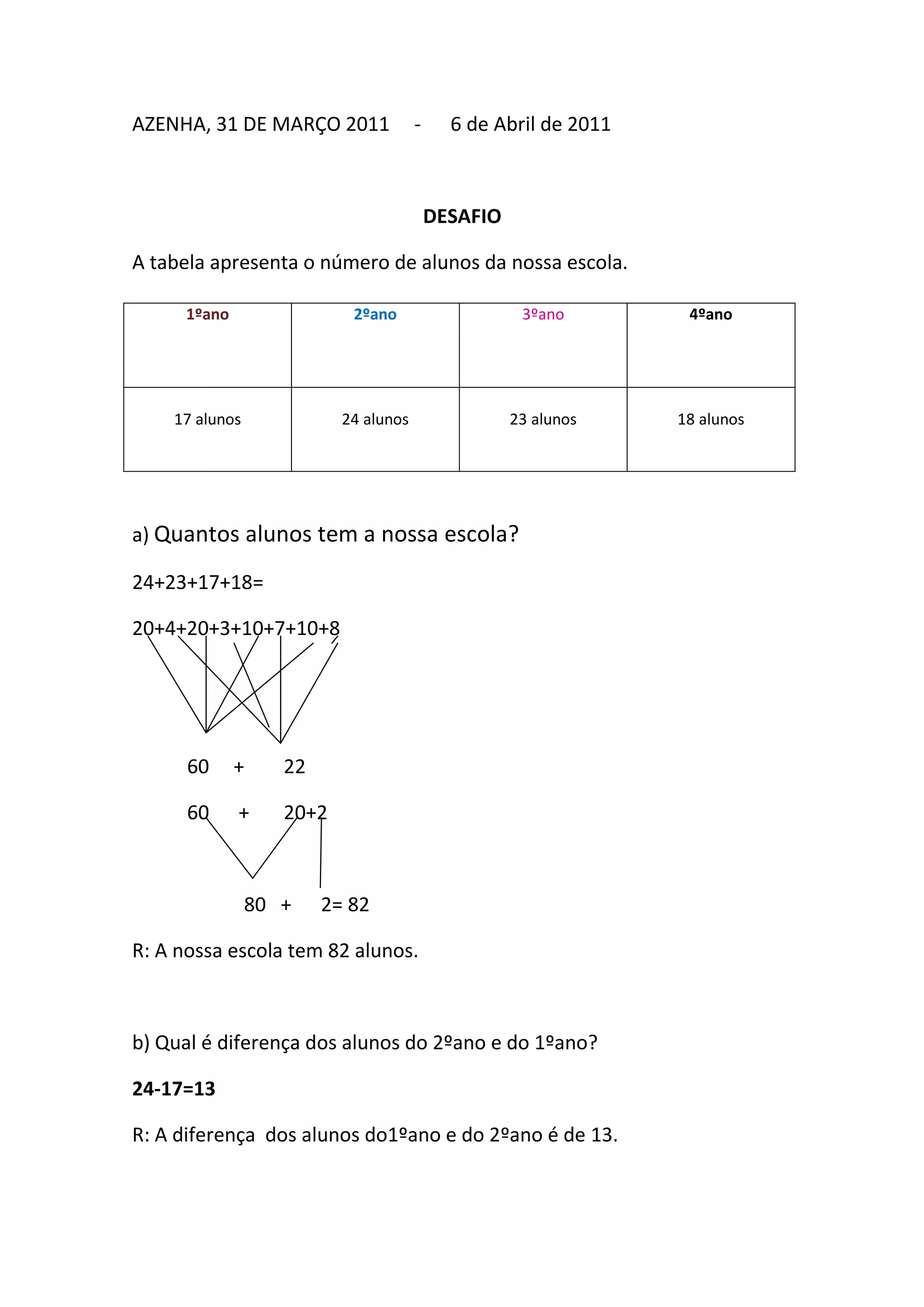 O documento apresenta o número de alunos em cada ano de uma escola. No total, há 17 alunos no 1o ano, 24 no 2o ano, 23 no 3o ano e 18 no 4o ano, o que soma 82 alunos na escola. A diferença entre os alunos do 1o e 2o ano é de 13 estudantes.